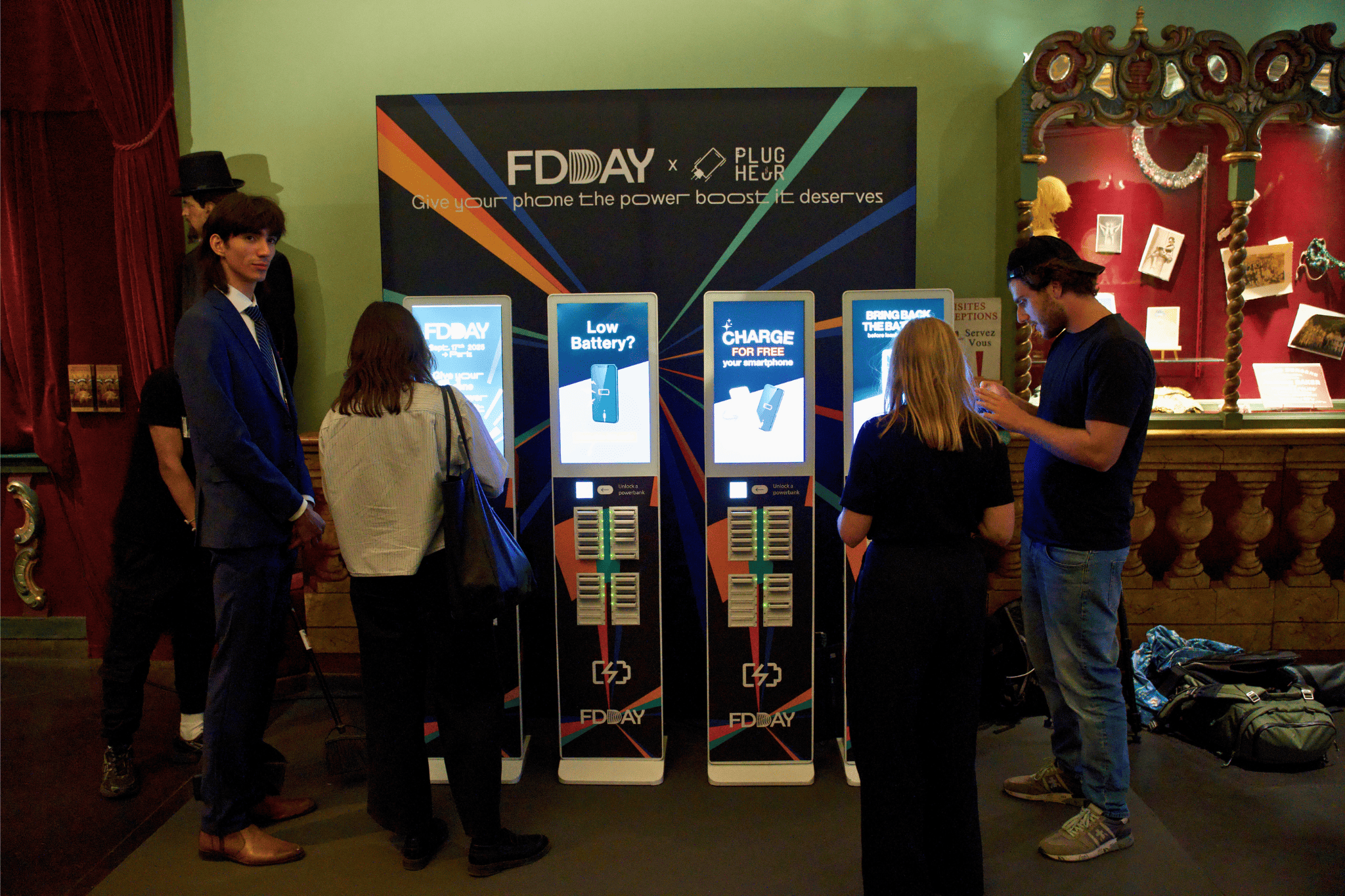 Plug'Heur fornece baterias portáteis self-service através de uma estação. Os visitantes pedem uma bateria emprestada em poucos segundos, recarregam o telefone enquanto estão em movimento e depois devolvem a qualquer terminal Plug'Heur no local.